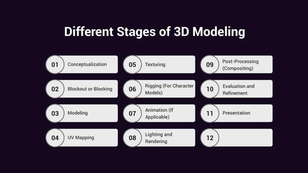 3D Modeling is a multi-stage process that involves creating three-dimensional digital representations of objects, characters, environments, or concepts. These stages are essential for achieving a final, detailed 3D model. Here are the typical stages of 3D Modeling: