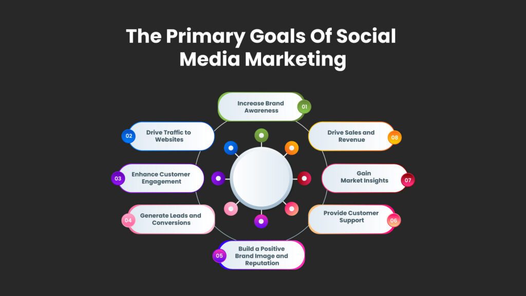 The primary goals of social media marketing are multifaceted, aiming to utilize the power of social media platforms to enhance brand presence, engage with the target audience, drive website traffic, and ultimately contribute to business growth. Here are the fundamental goals in detail: